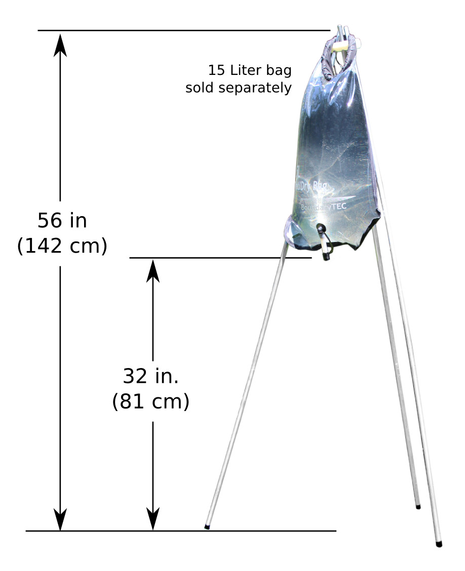 Use the tripod to support a 15L Bag while heating water with our ShowerCoil™ system or use to dispense water for a campsite wash station.